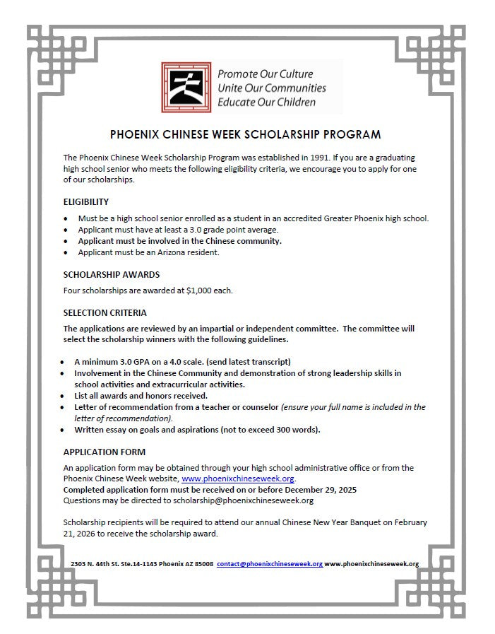 Thank you for your interest in being a Phoenix Chinese Week scholar! Please read all scholarship requirements & information.
