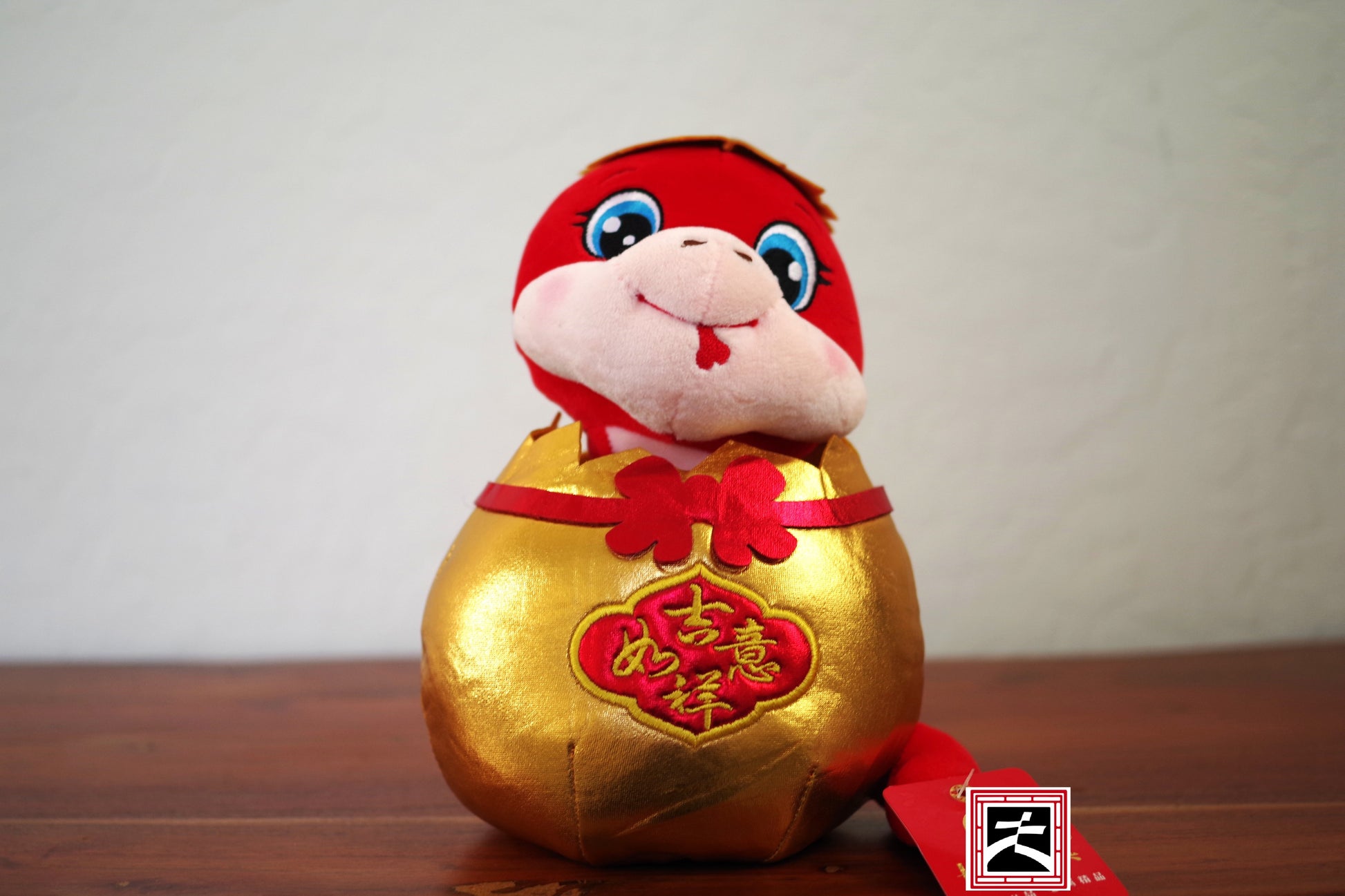 This adorable plush red snake peeks out from a festive golden egg. The soft, cuddly snake features big blue eyes and playful details, while the shimmering gold egg is accented with red ribbons and embroidered Chinese characters.